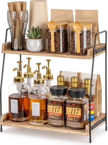 Two levels for better organization. Use the top tier for beans, syrups, or frequently used items and the bottom tier for mugs, K‑cups, or less‑used tools. It helps keep everything organized and within reach so you’re not rummaging around every morning.