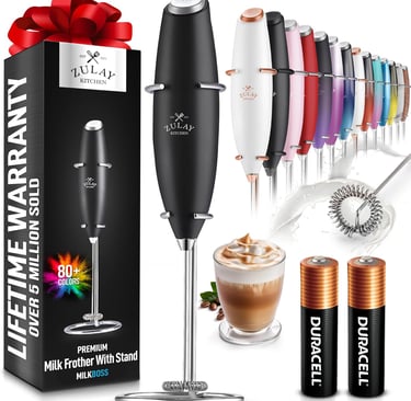 Zulay Kitchen Powerful Milk Frother Wand With 2 Duracell Batteries - Ultra Fast Handheld Drink Mixer - Electric Whisk Foam Maker for Coffee, Lattes, Cappuccino, Matcha, Hot Chocolate & Creamer - Black